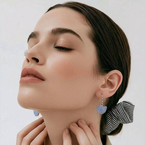 Pendientes tipo gancho en plata 925 con pieza de piedra natural de calcedonia facetada, en un precioso tono azul.