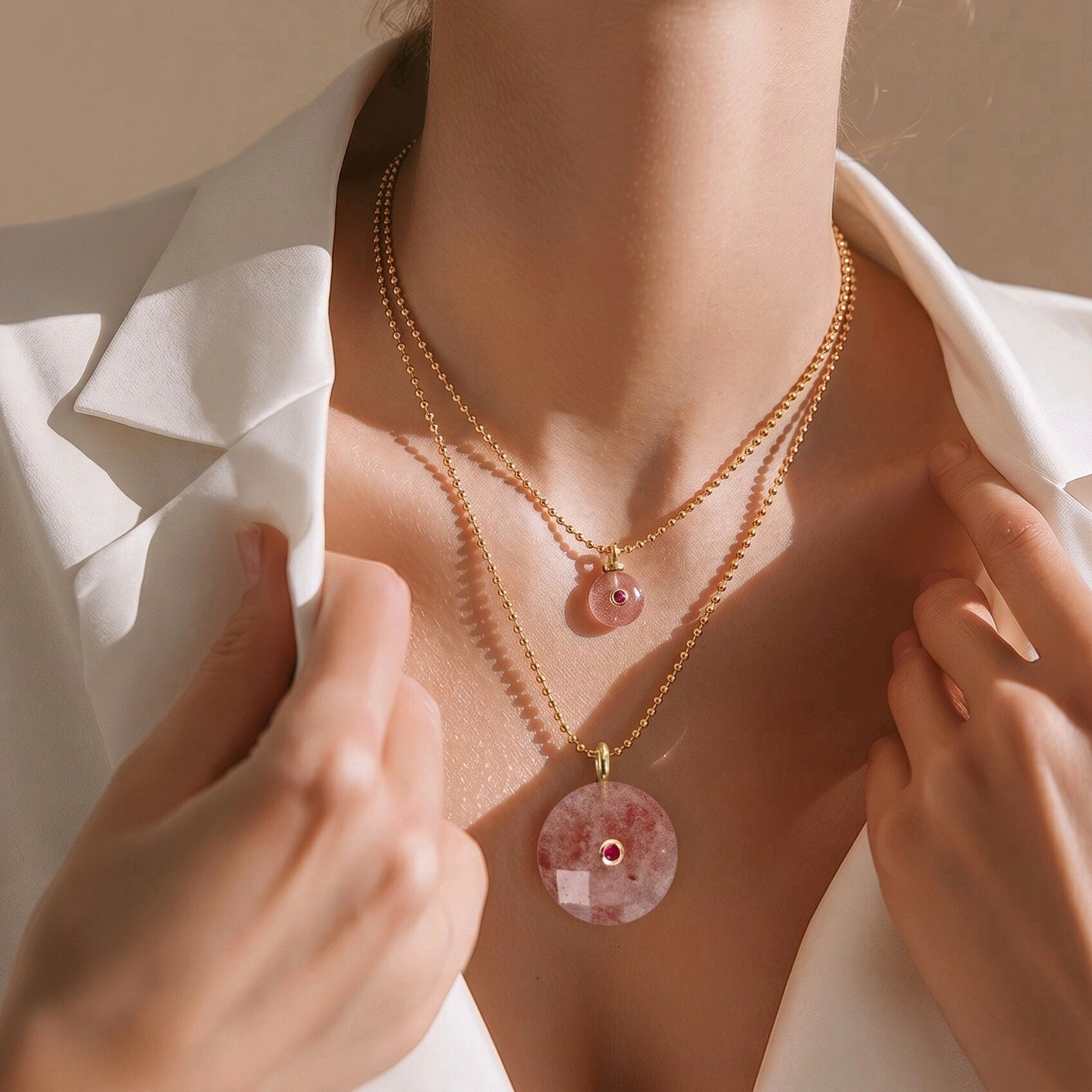 Precioso collar con cadena de bolitas y colgante circular de cuarzo fresa con superficie facetada y detalle de circonita cúbica fucsia en el centro.