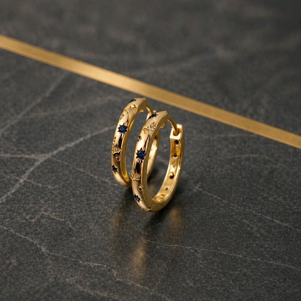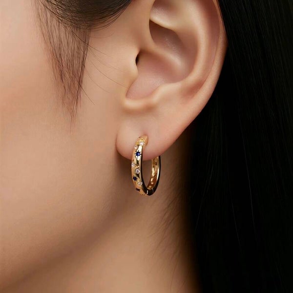 Pendientes con forma de aro con diseño de estrellas y luna con pequeñas circonitas cúbicas engastadas.