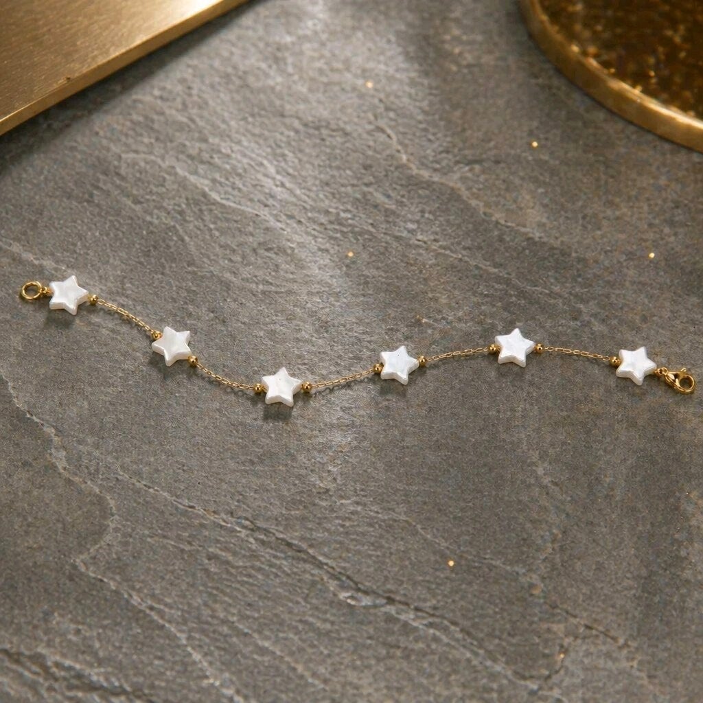 Fina pulsera realizada en acero inoxidable chapado en oro de 18kt y piezas de nácar blanco con forma de estrella.
