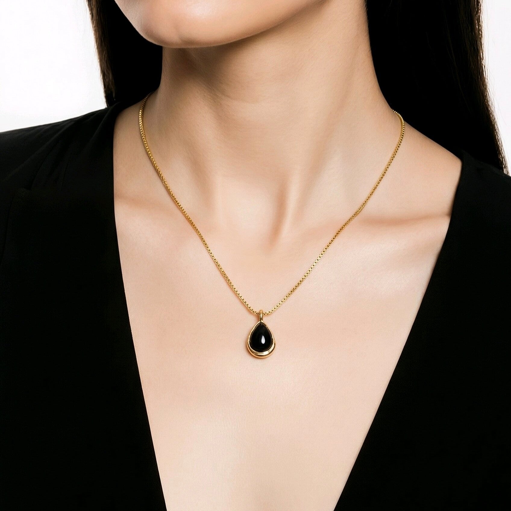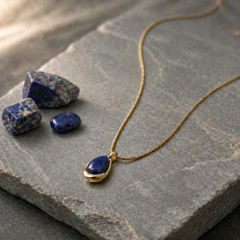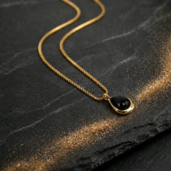 Collar con fina cadena cuadrada con pequeño colgante en forma de gota o lágrima con pieza de piedra ónix o lapislázuli. Chapado en oro de 18kt.